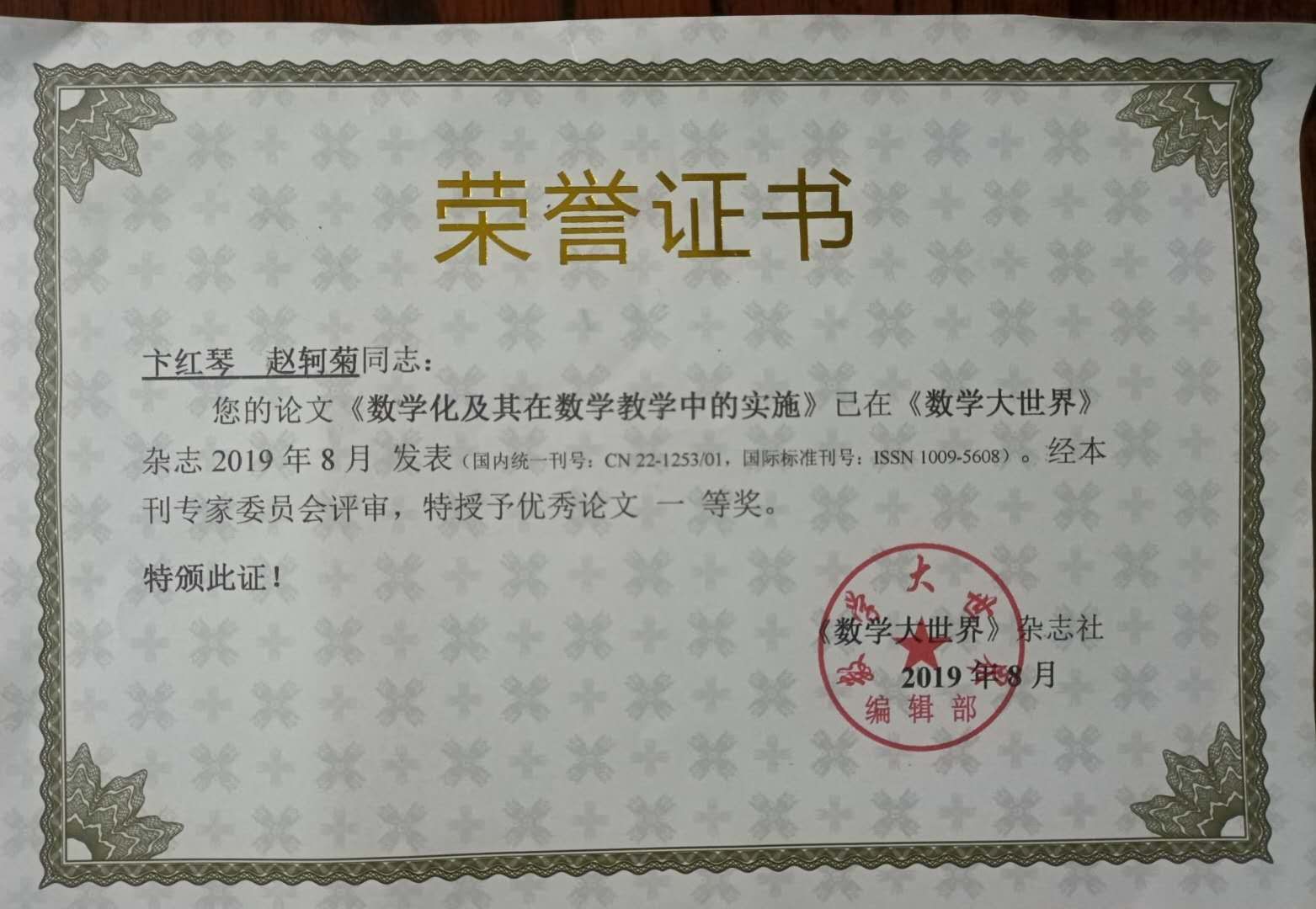 卞红琴 赵轲菊论文《数学化及其在数学教学中的实施》发表在《数学大世界》杂志2019年8月