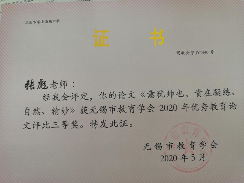张彪老师荣获无锡市教育学会2020年优秀教育论文评比三等奖