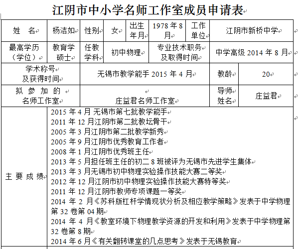 庄益君江阴市名师工作室成员个人信息——杨洁如