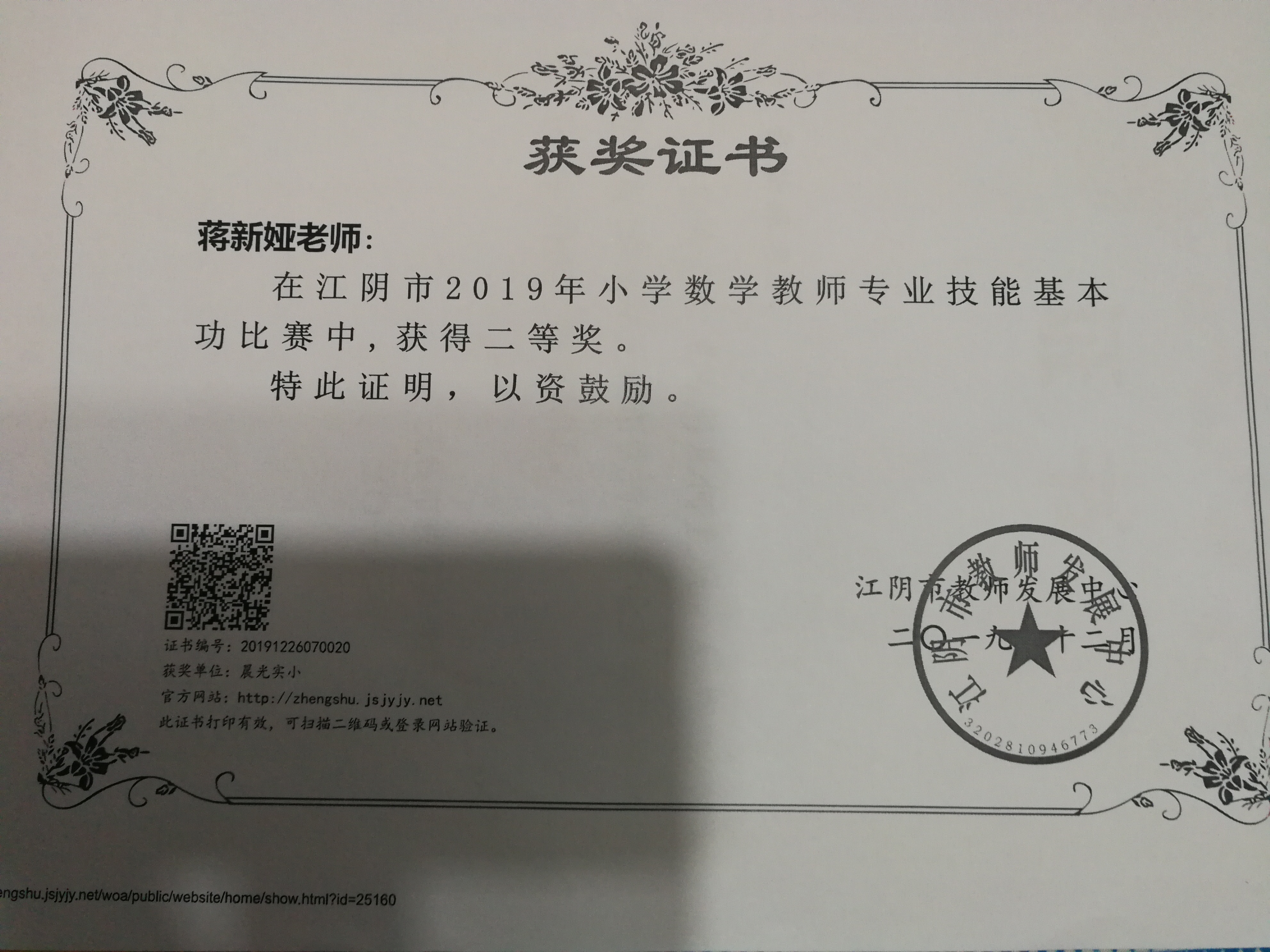 徐顺湘名师工作室成员蒋新娅获江阴市小学数学教师基本功比赛二等奖