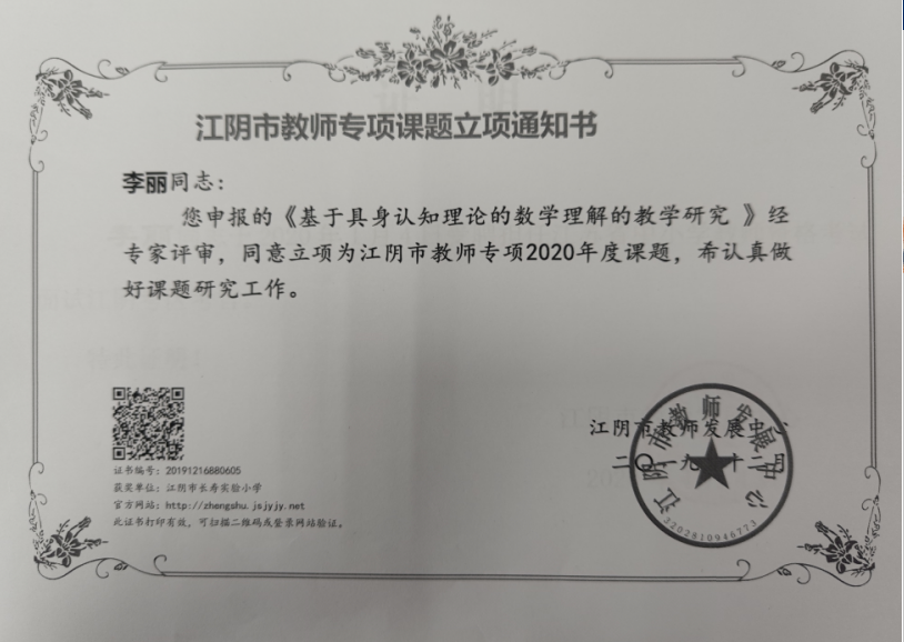 李丽主持江阴市专项课题《基于具身认知理论的数学理解的教学研究》