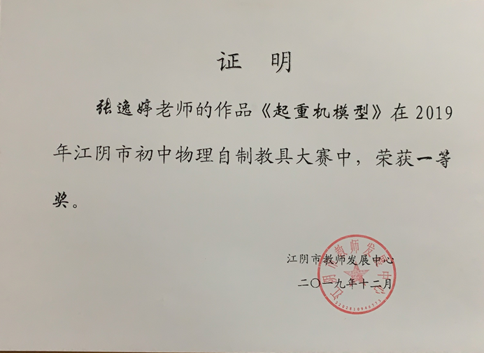 张逸婷老师的《起重机模型》获江阴市初中物理自制教具比赛一等奖