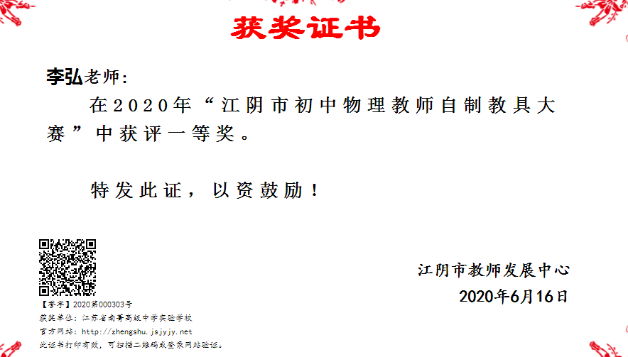 李弘老师获得2020年江阴市初中物理自制教具比赛一等奖