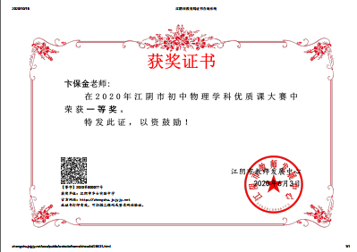 卞保金老师获的2020年江阴市“三力”课堂大比武初中物理一等奖