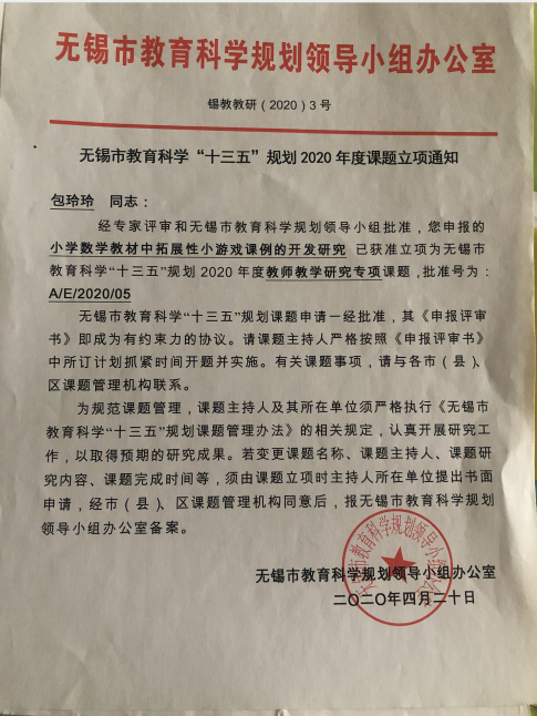 包玲玲主持无锡市教育科学“十三五”规划课题《小学数学教材中拓展性小游戏课例的开发研究》