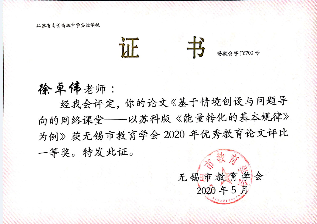 徐卓伟老师“基于情境创设与问题导向的网络课堂”获得无锡市教育学会优秀论文评比一等奖