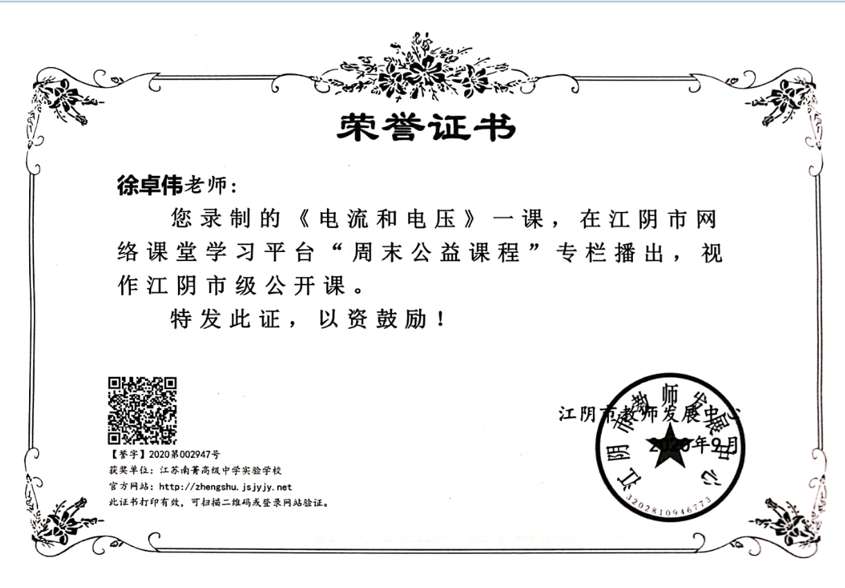 徐卓伟老师录制的《电流和电压》在江阴市网络课堂学习平台“周末公益课堂”专栏播出