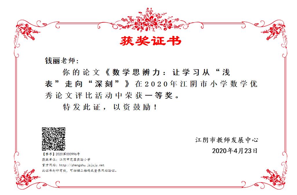 无锡市徐顺湘名师工作室成员钱丽《数学思辨力:让学习从浅表走向深刻》获江阴市数学教学论文一等奖