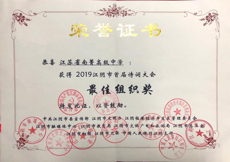 南菁高中获2019江阴市首届诗词大会“最佳组织奖”