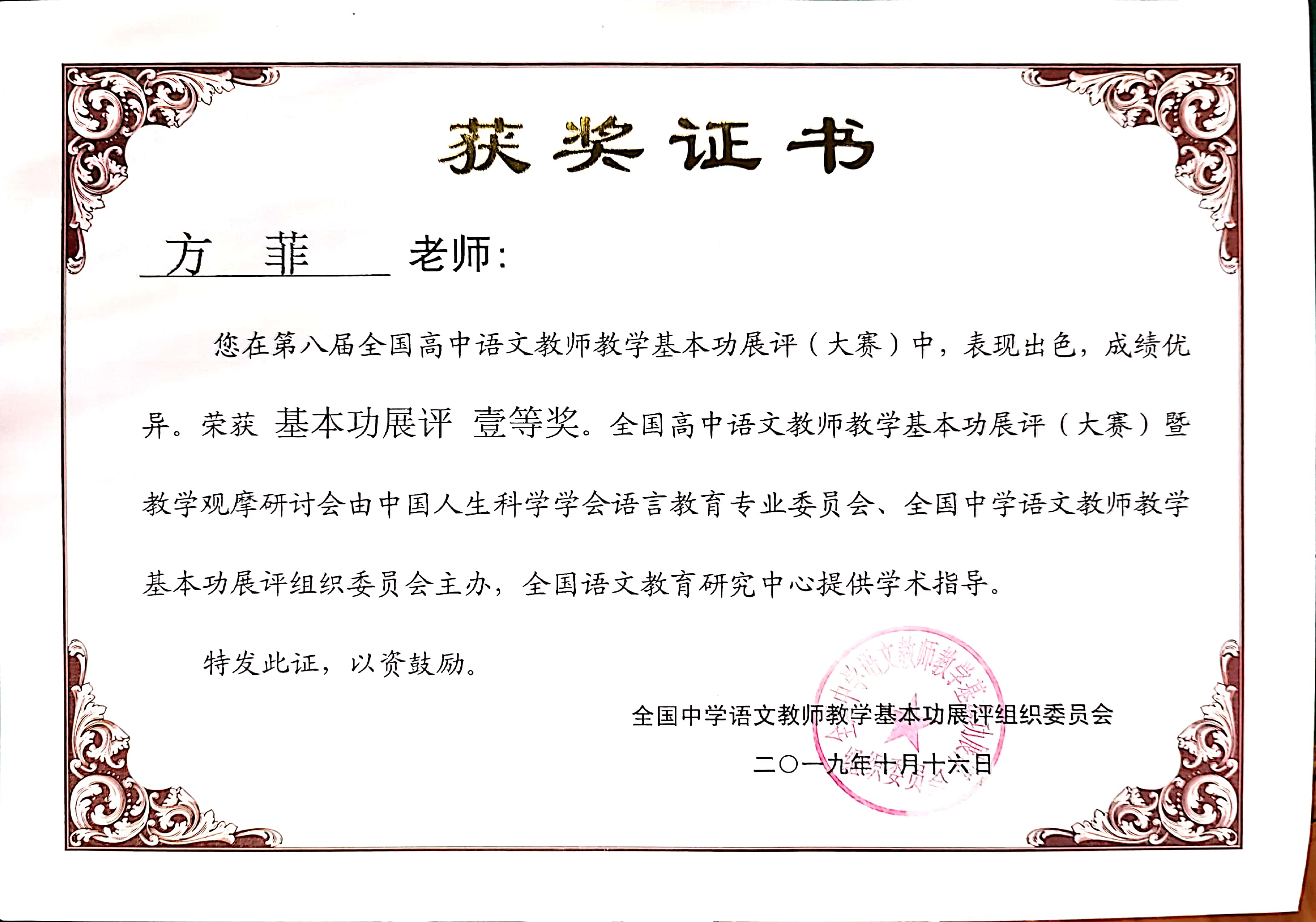 方菲老师获第八届全国高中语文教师教学基本展评一等奖
