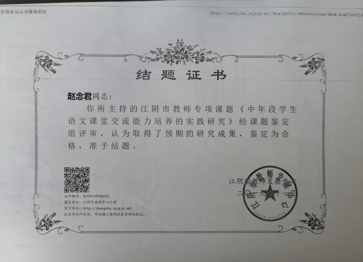 赵念君江阴市教师专项课题结题