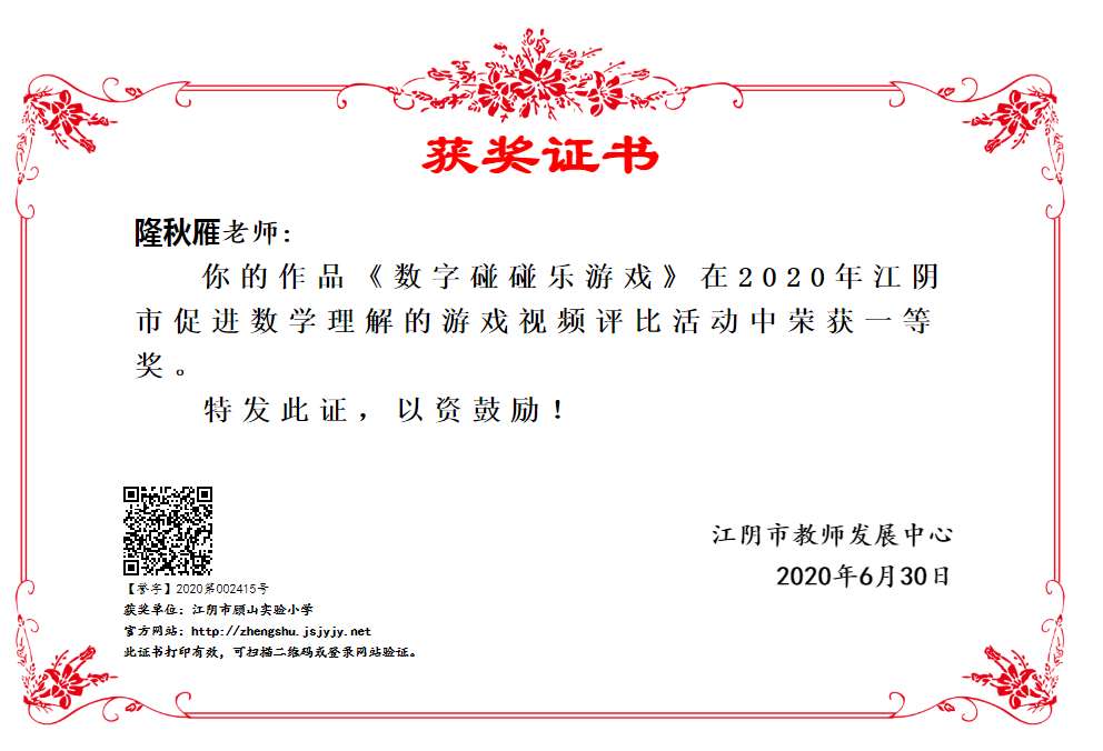 《调兵遣将》获江阴市促进数学理解的游戏视频评比获一等奖