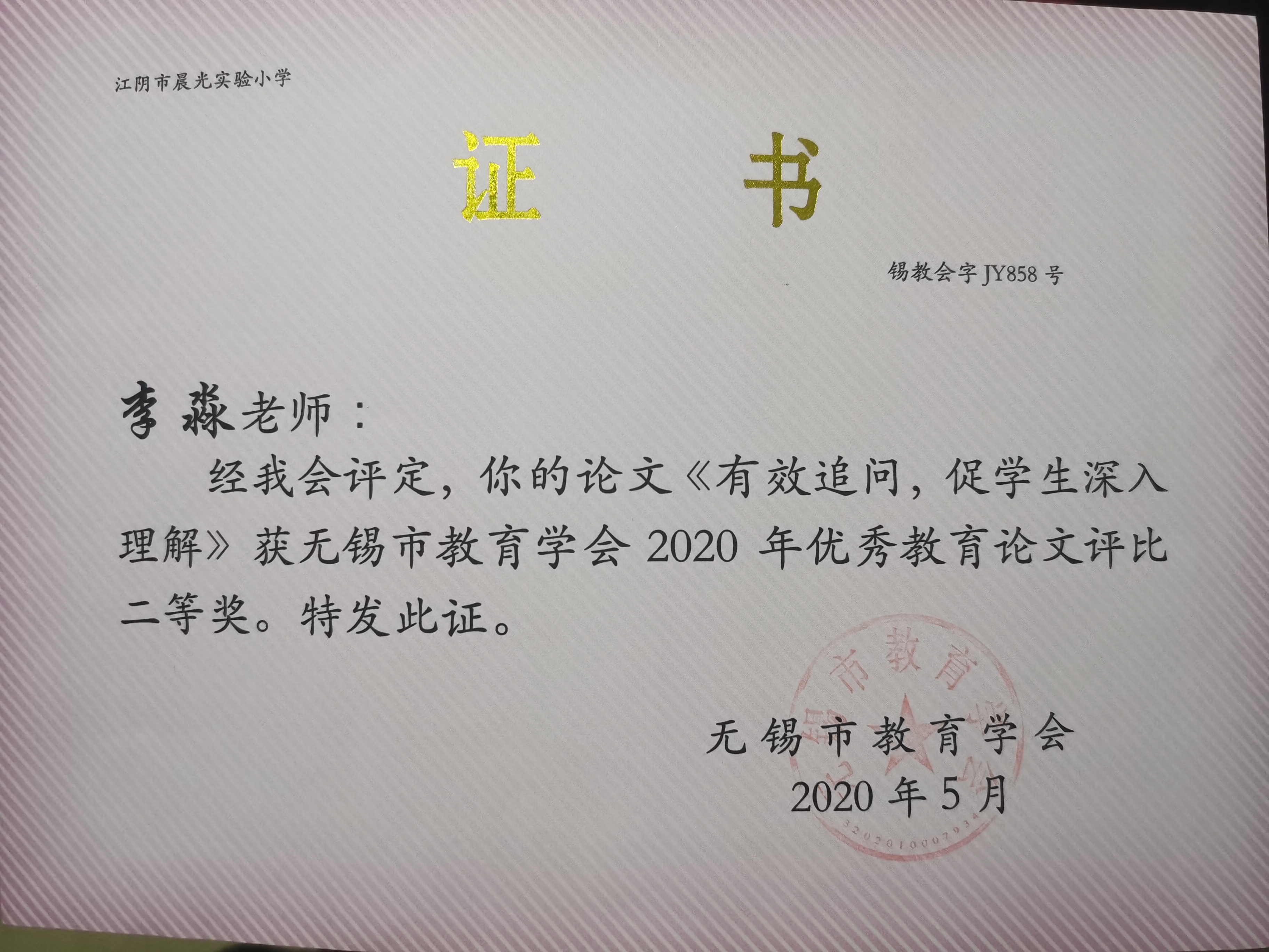 匡金龙名师工作室成员王宜琴老师论文获江苏省“行知杯”征文二等奖