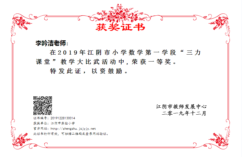 赵明老师辅导的学生获江阴市“望江杯”初一英文阅读大赛一等奖