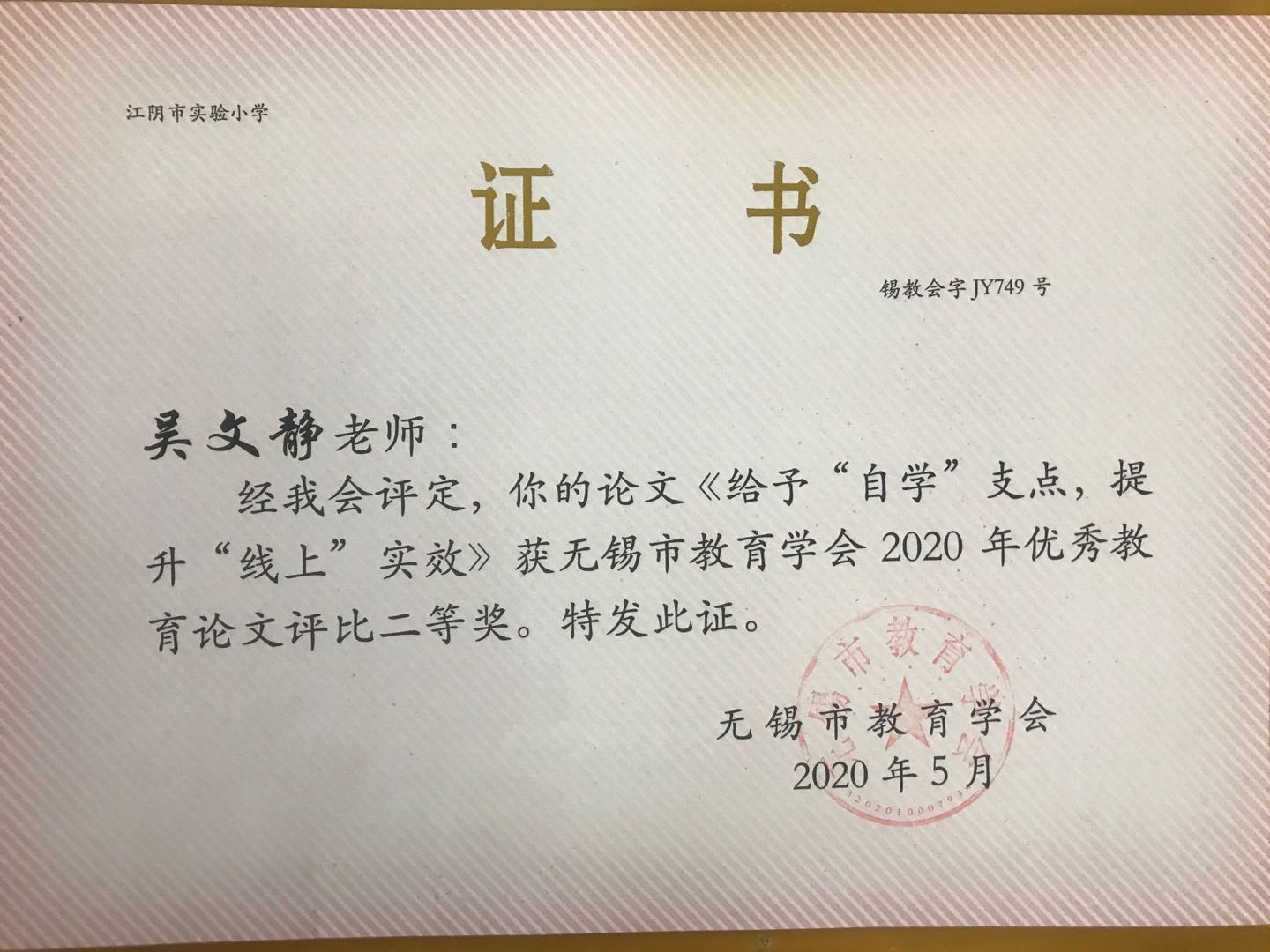 匡金龙名师工作室成员吴文静老师论文获无锡市二等奖