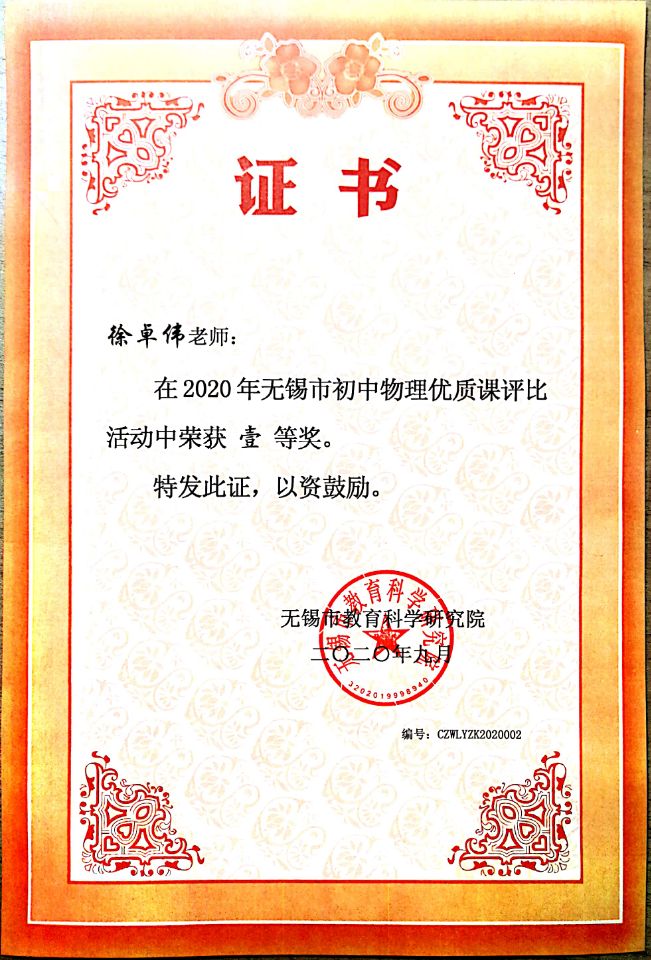 徐卓伟老师获得2020年无锡市初中物理优质评比一等奖