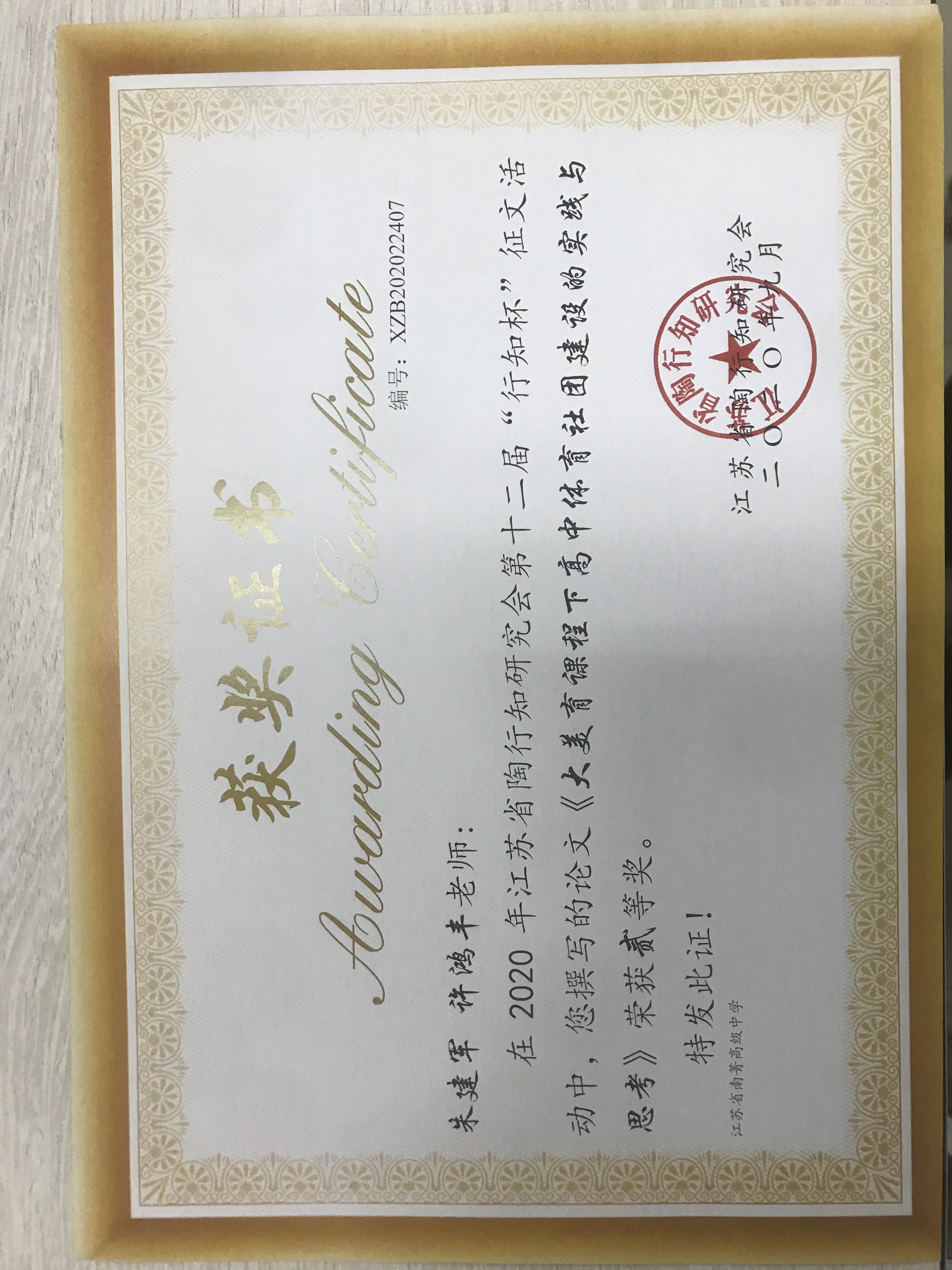 朱建军老师论文 “大美育课程下高中体育社团建设的实践与思考”获江苏省“行知杯”论文大赛二等奖