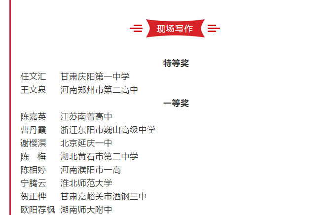 江苏省南菁高级中学陈嘉英老师在现场写作比赛中获得一等奖。