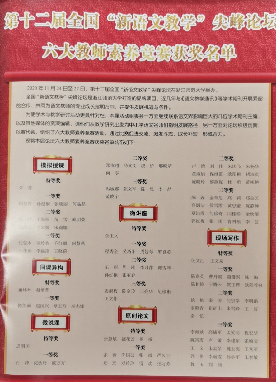 陈嘉英老师在第十二届全国“新语文教学”尖峰论坛现场写作比赛中荣获一等奖