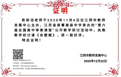 2020年11月6日陈彬洁老师在“全国第六届审美课堂”执教的公开课——《赤壁赋》获得一致好评。