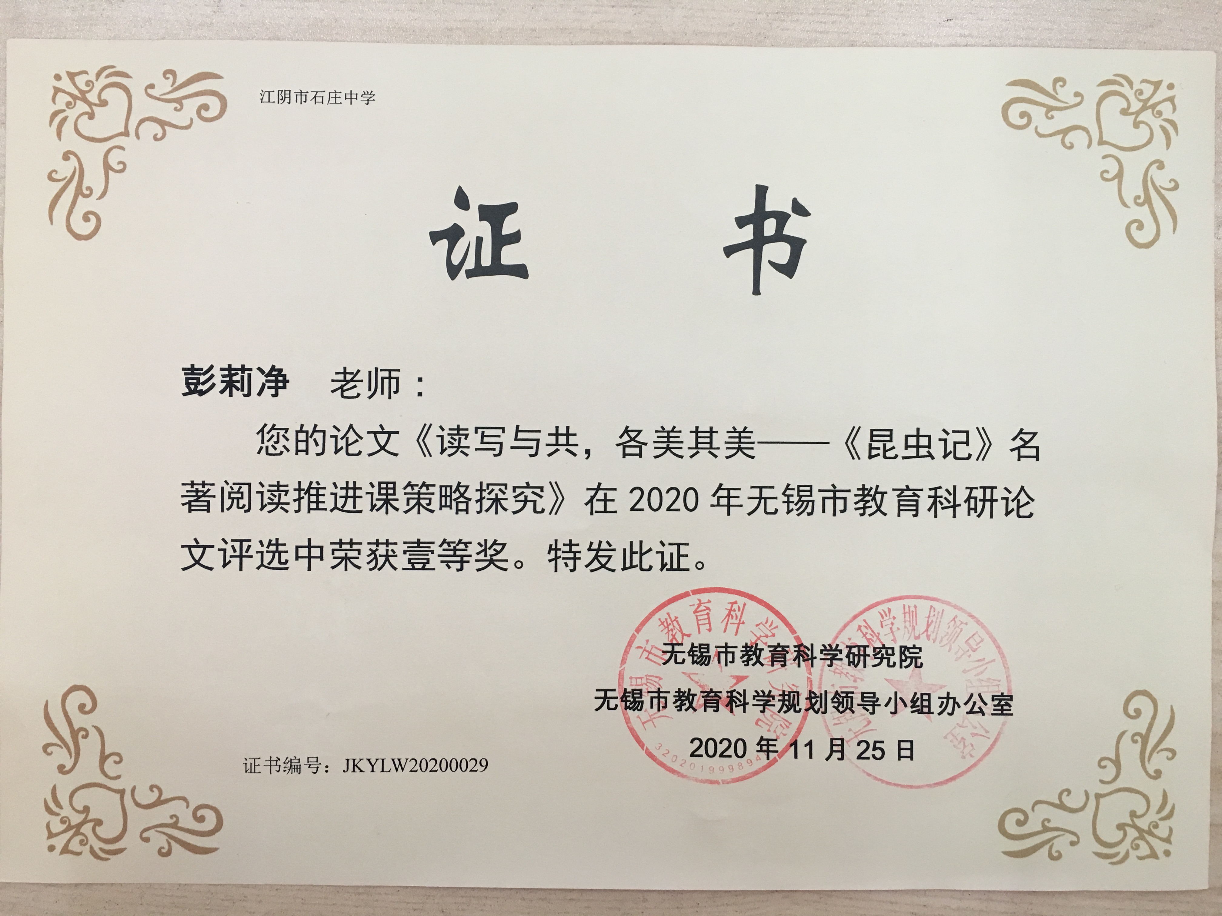 杨春方名师工作室彭莉净老师论文获一等奖