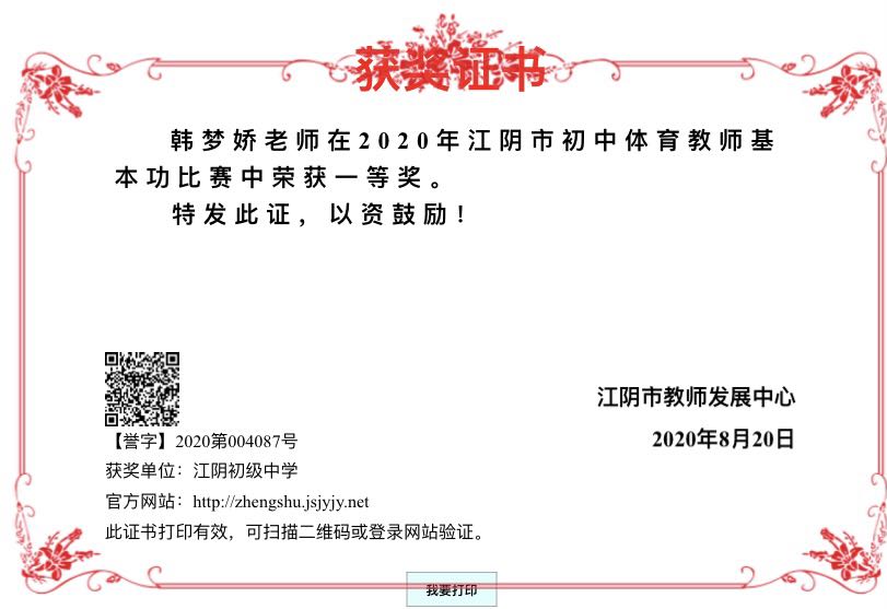 韩梦娇老师获江苏省初中体育与健康课程二次备课与课堂教学评选三等奖