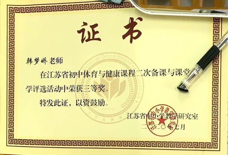韩梦娇老师获江苏省初中体育与健康课程二次备课与课堂教学评选三等奖
