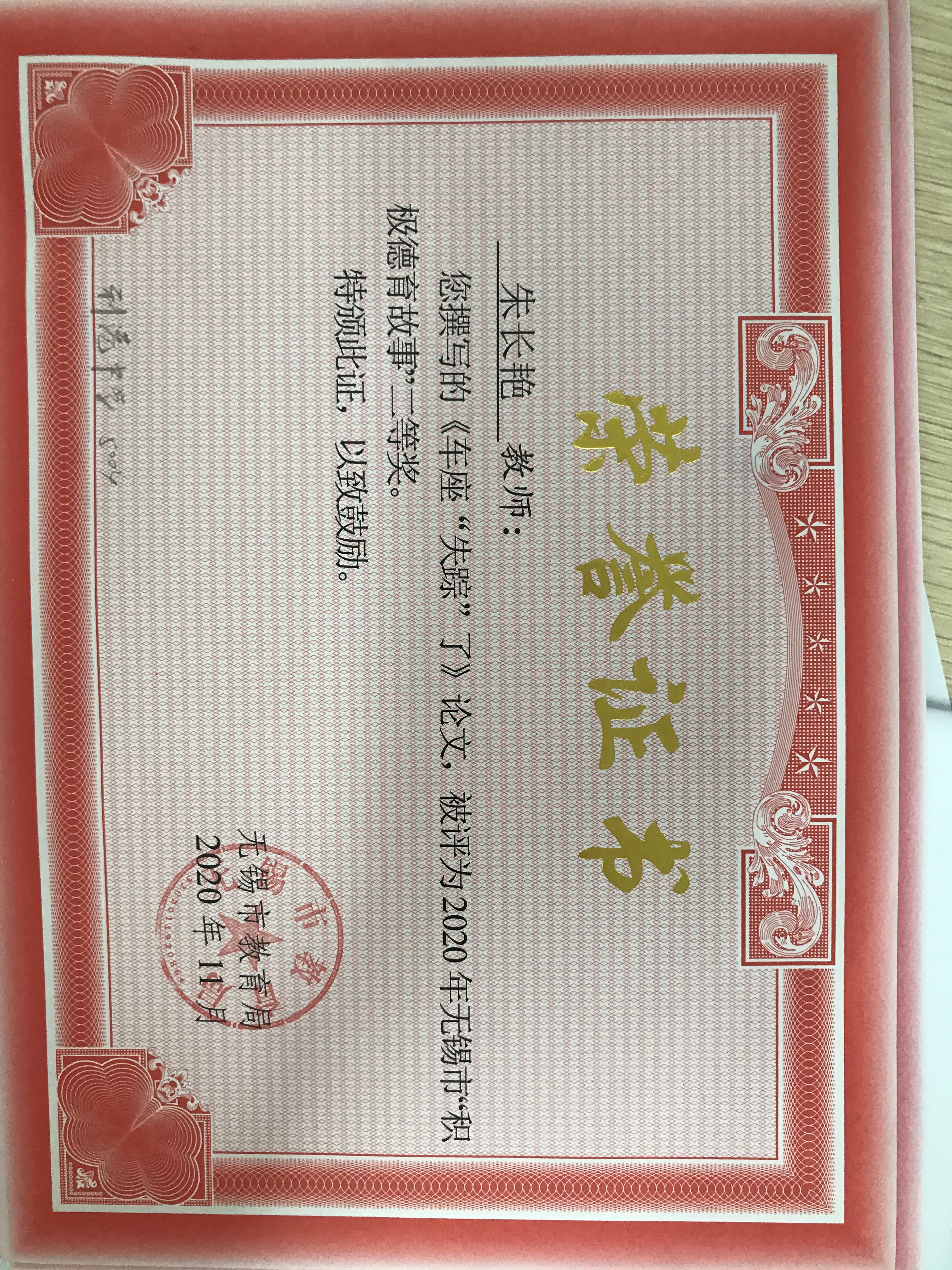 朱长艳老师撰写的《车座失踪了》论文被评为无锡市2020积极德育故事二等奖
