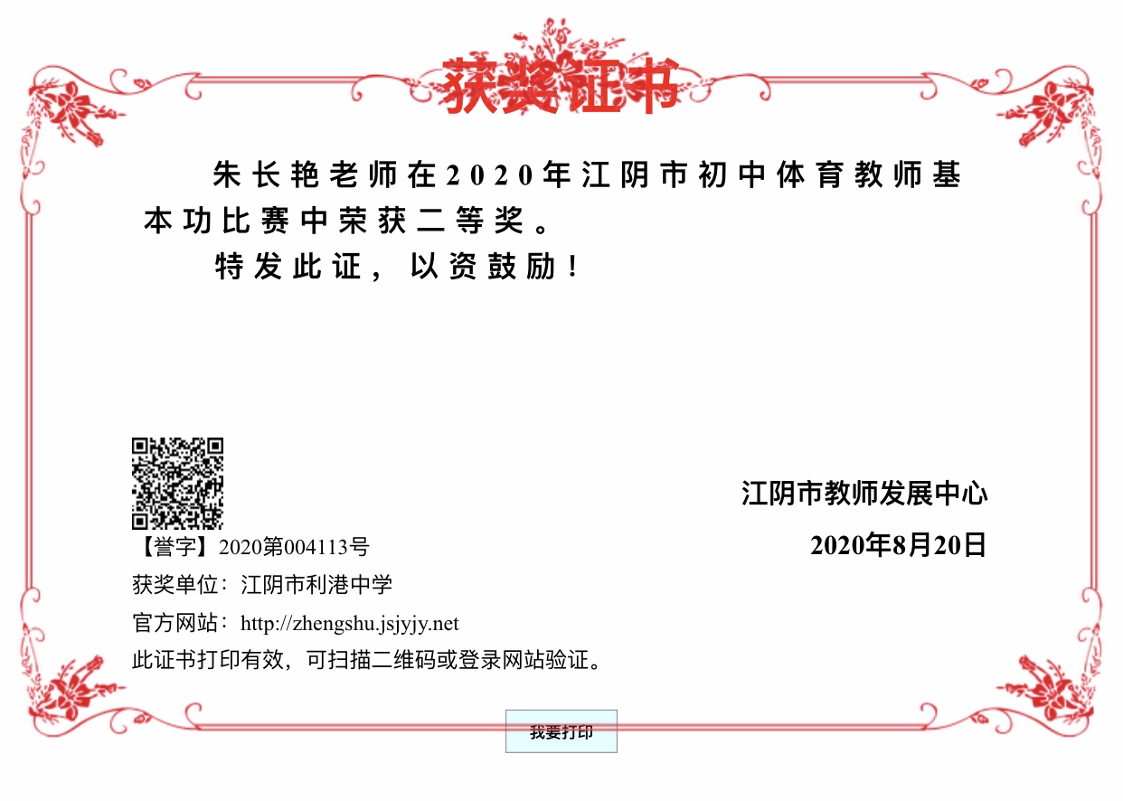 朱长艳老师获初中体育教师基本功比赛中二等奖