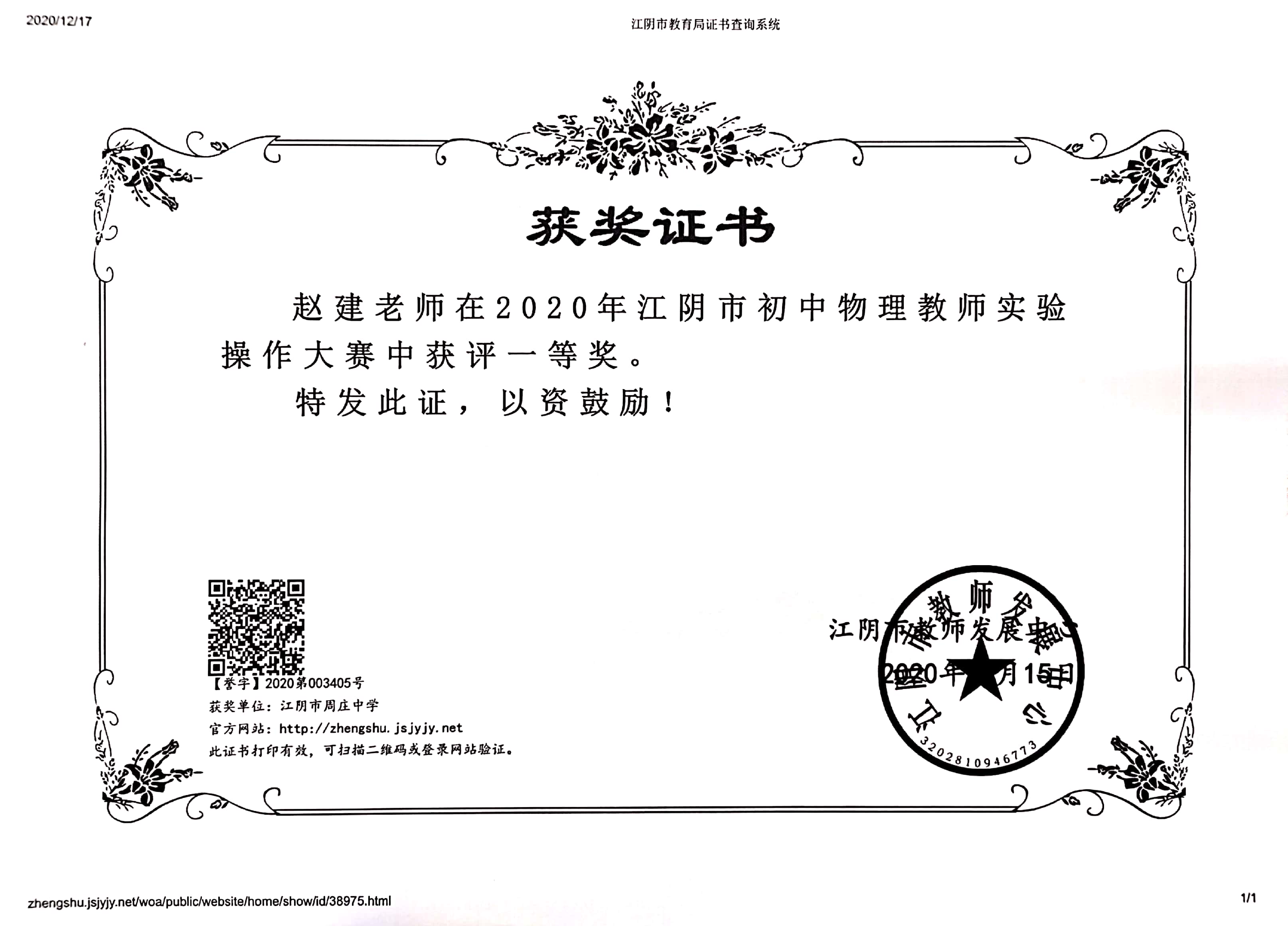 庄益君名师工作室成员赵建老师江阴市实验操作比赛一等奖