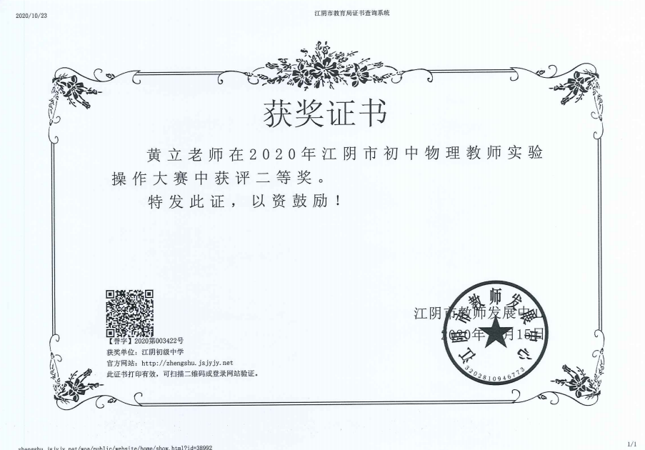 庄益君名师工作室成员黄立老师江阴市实验操作比赛二等奖