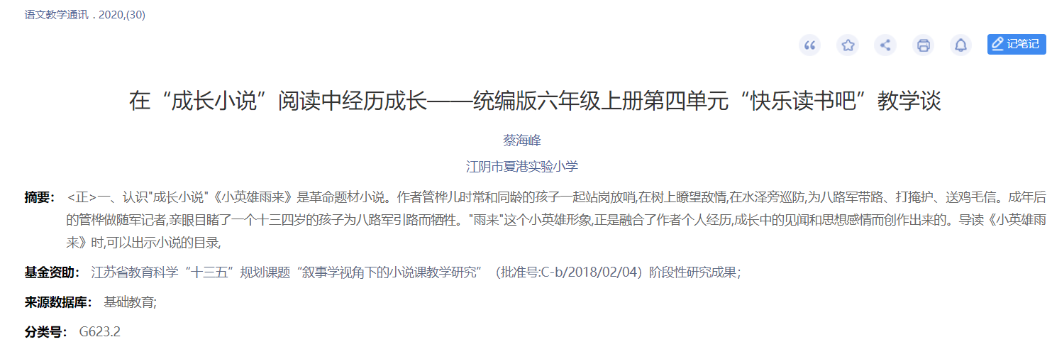 学员蔡海峰论文《在“成长小说”阅读中经历成长》发表于《语文教学通讯》第10期