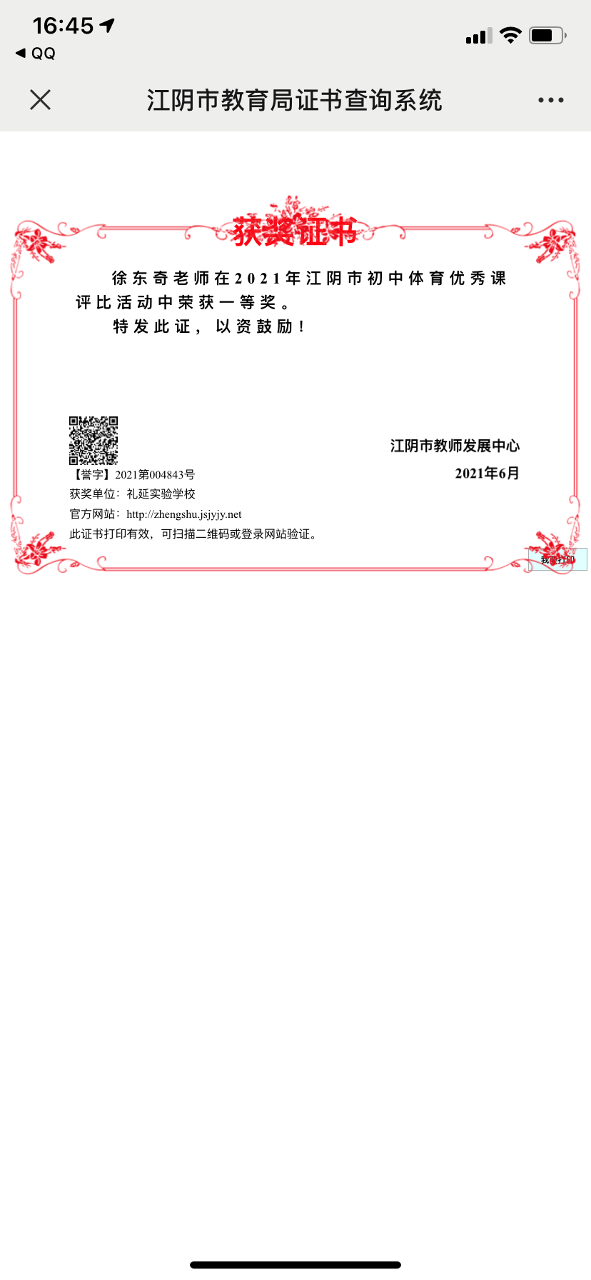 沈凯雅获2021江阴市教师基本功大赛(总分)一等奖