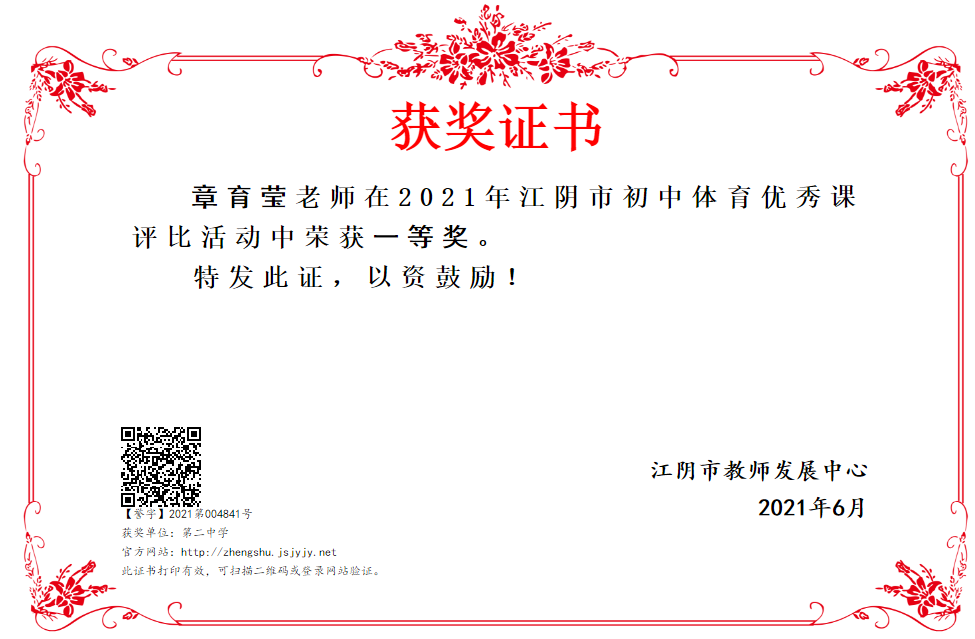 沈菁名师工作室成员——章育莹获市初中体育优秀课评比一等奖