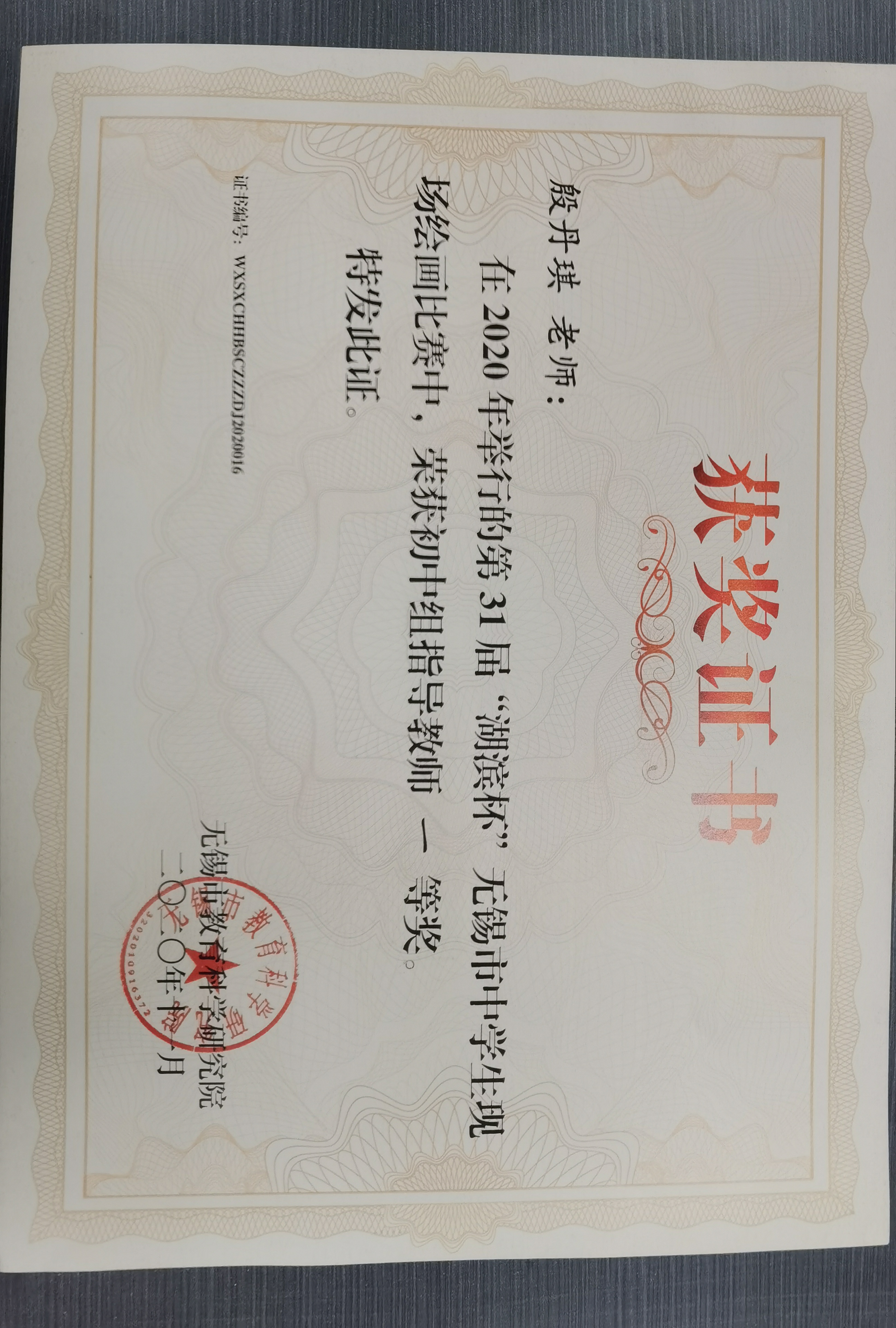 31届“滨湖杯”现场绘画比赛,荣获初中组指导教师一等奖