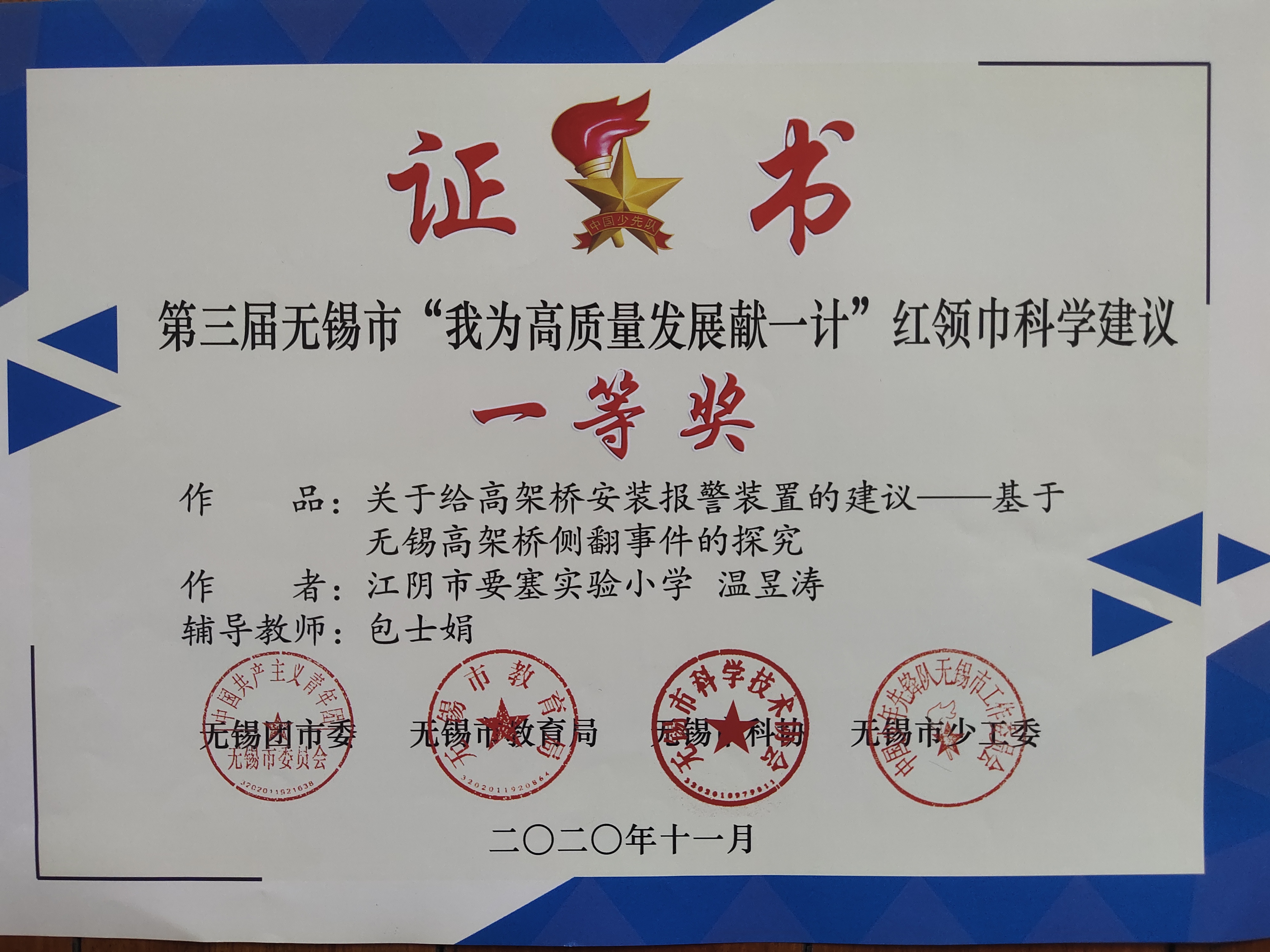 包士娟老师辅导学生荣获第三届无锡市“我为高质量发展献一计”红领巾科学建议一等奖
