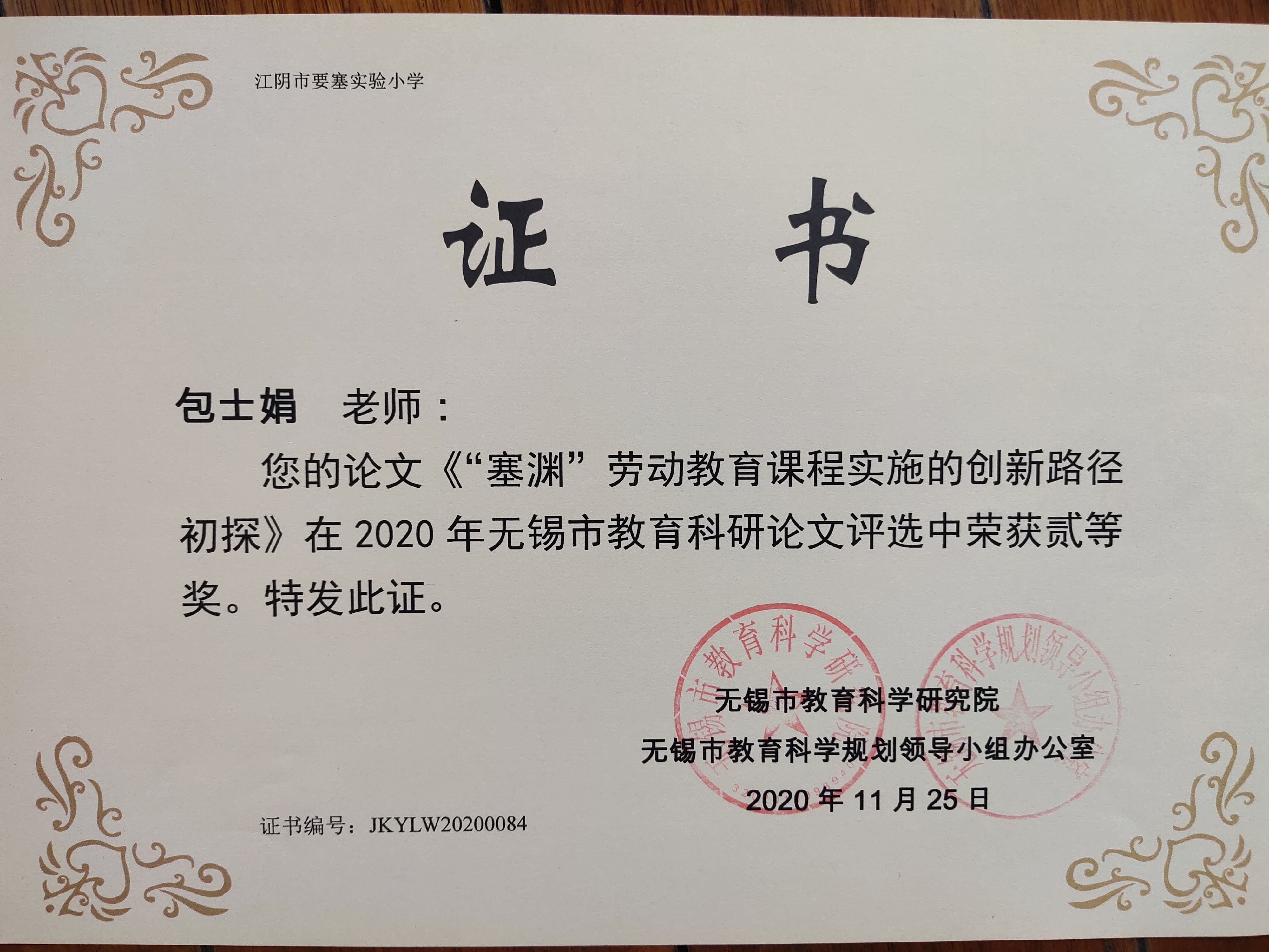 包士娟老师教学论文《“塞渊”劳动教育课程实施的创新路径初探》荣获2020年无锡市教育科研论文评选二等奖