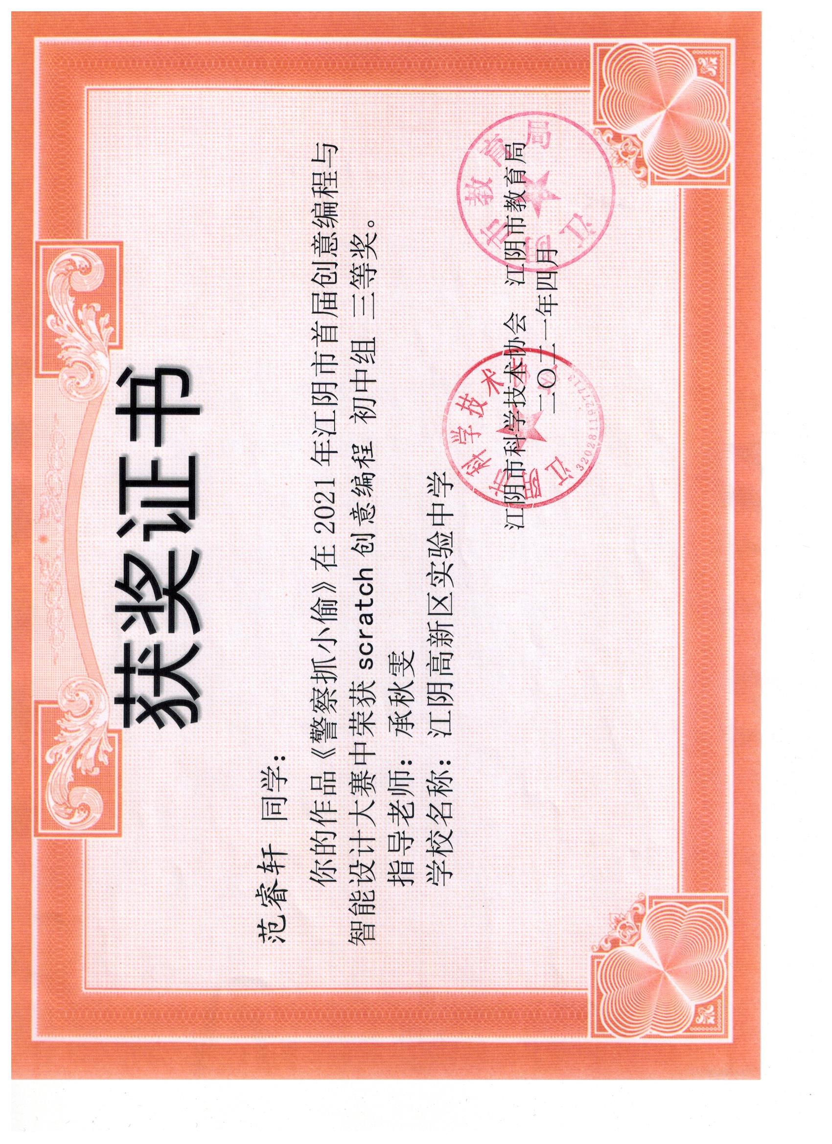 承秋雯老师辅导学生在2021年江阴市首届创意编程与智能设计大赛中荣获三等奖