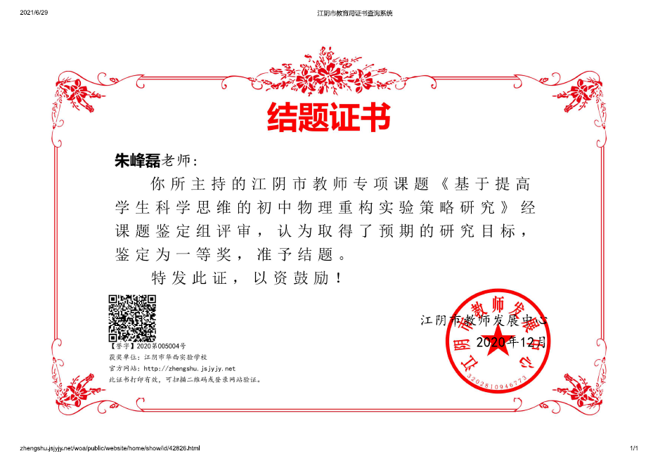 朱峰磊老师主持的江阴市教师专项课题经课题鉴定组评审,荣获一等奖