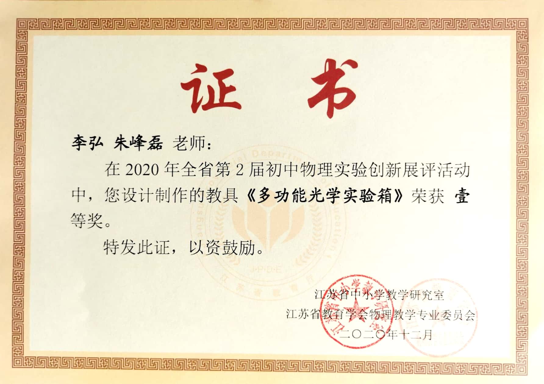 朱峰磊老师在2020年全省第二届初中物理创新实验展评活动中荣获一等奖