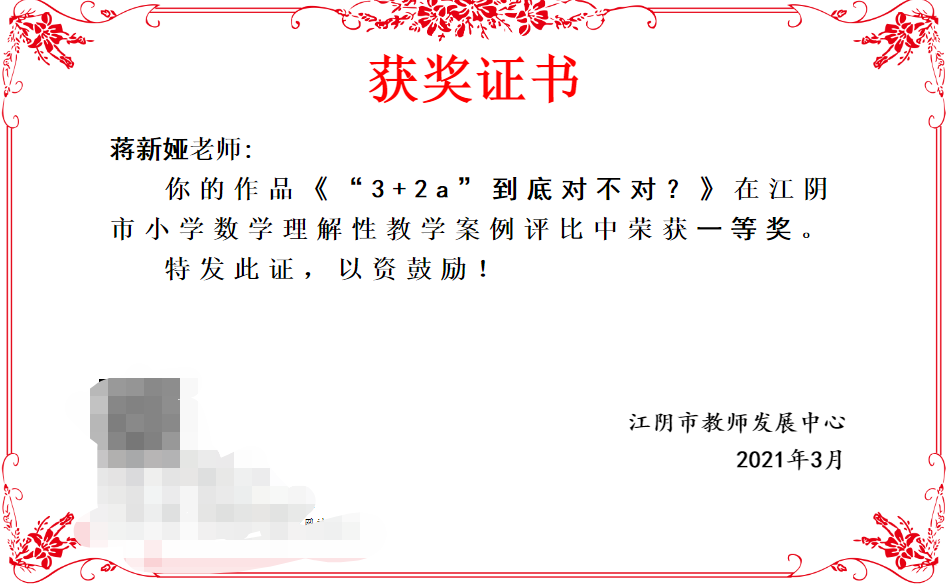 无锡市全顺名师工作室成员蒋新娅获江阴市小学数学理解性教学案例评比一等奖