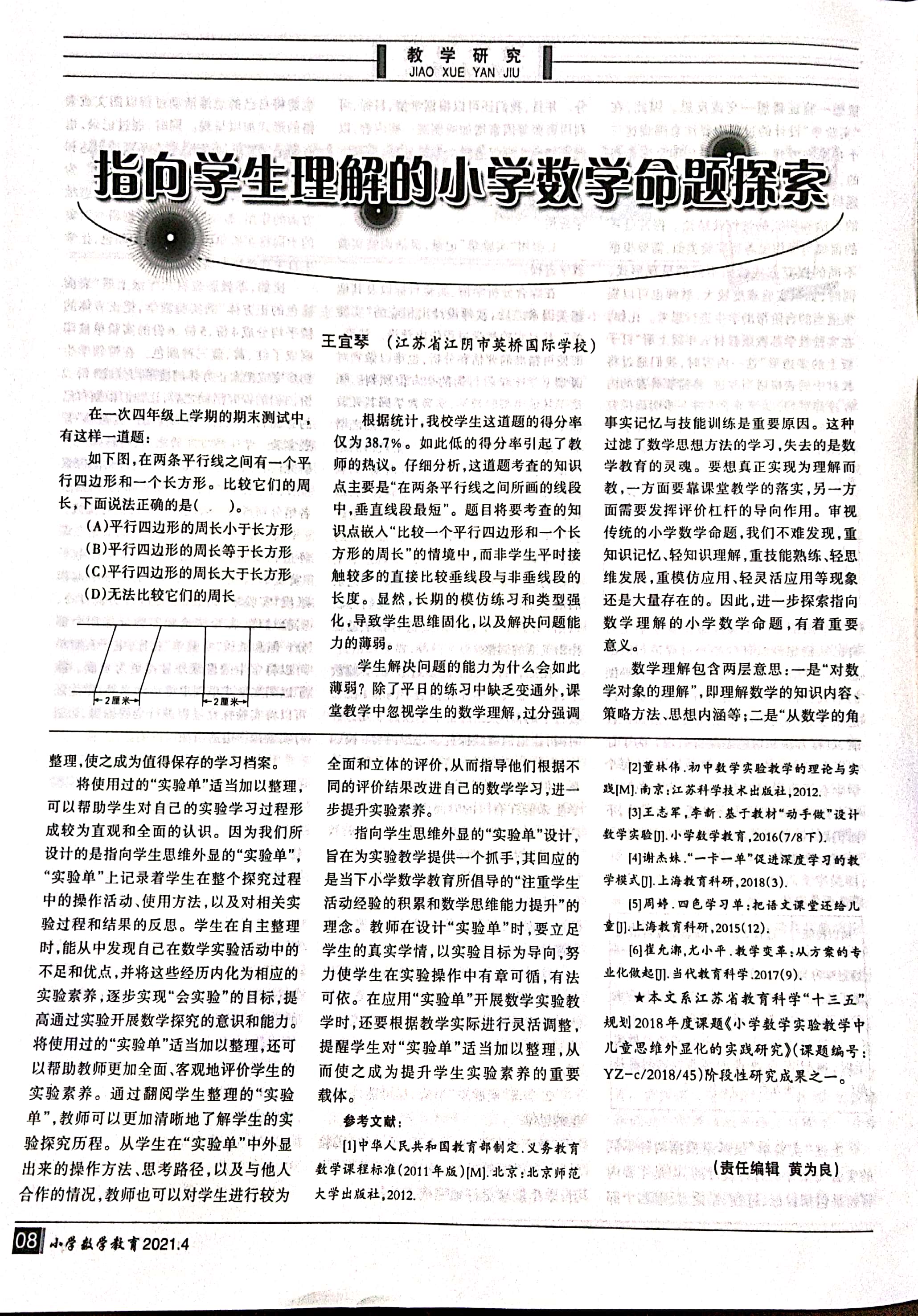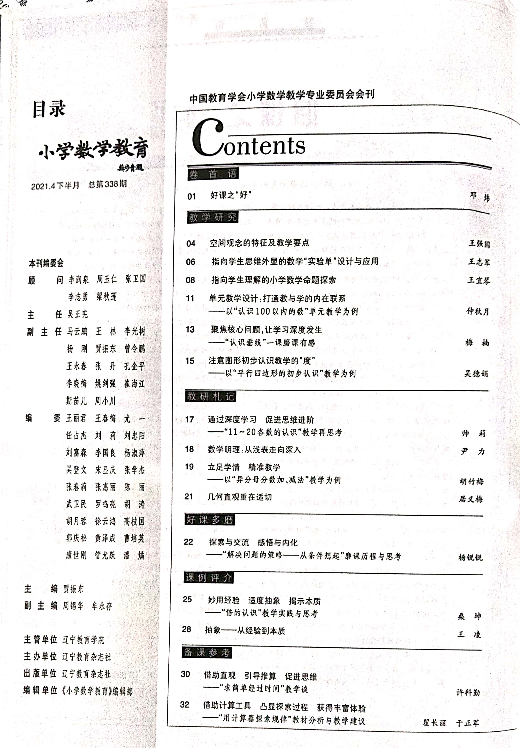 匡金龙名师工作室成员王宜琴老师论文发表于《小学数学教育》