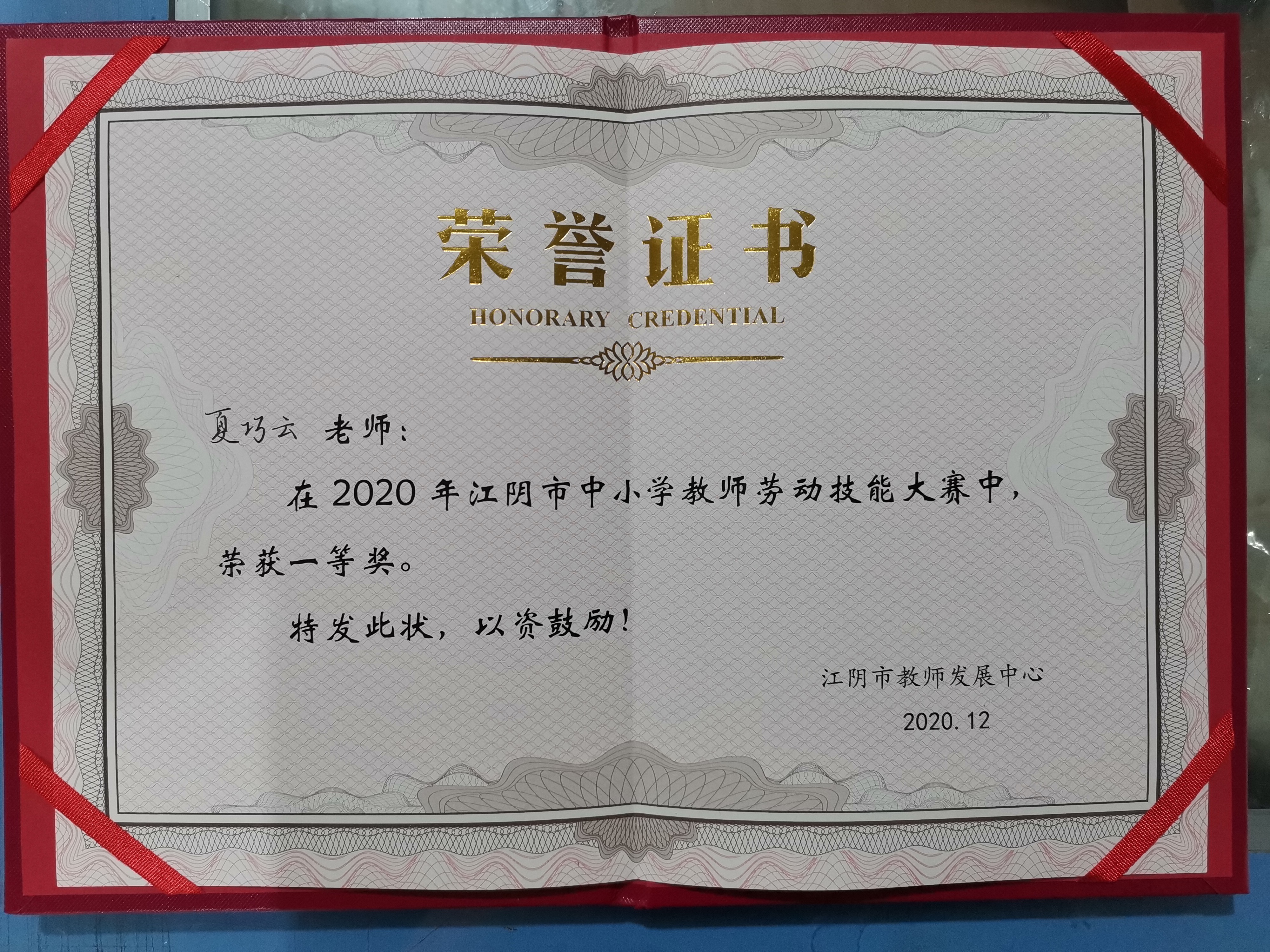 夏巧云老师2020年 荣获江阴市中小学教师劳动技能大赛一等奖
