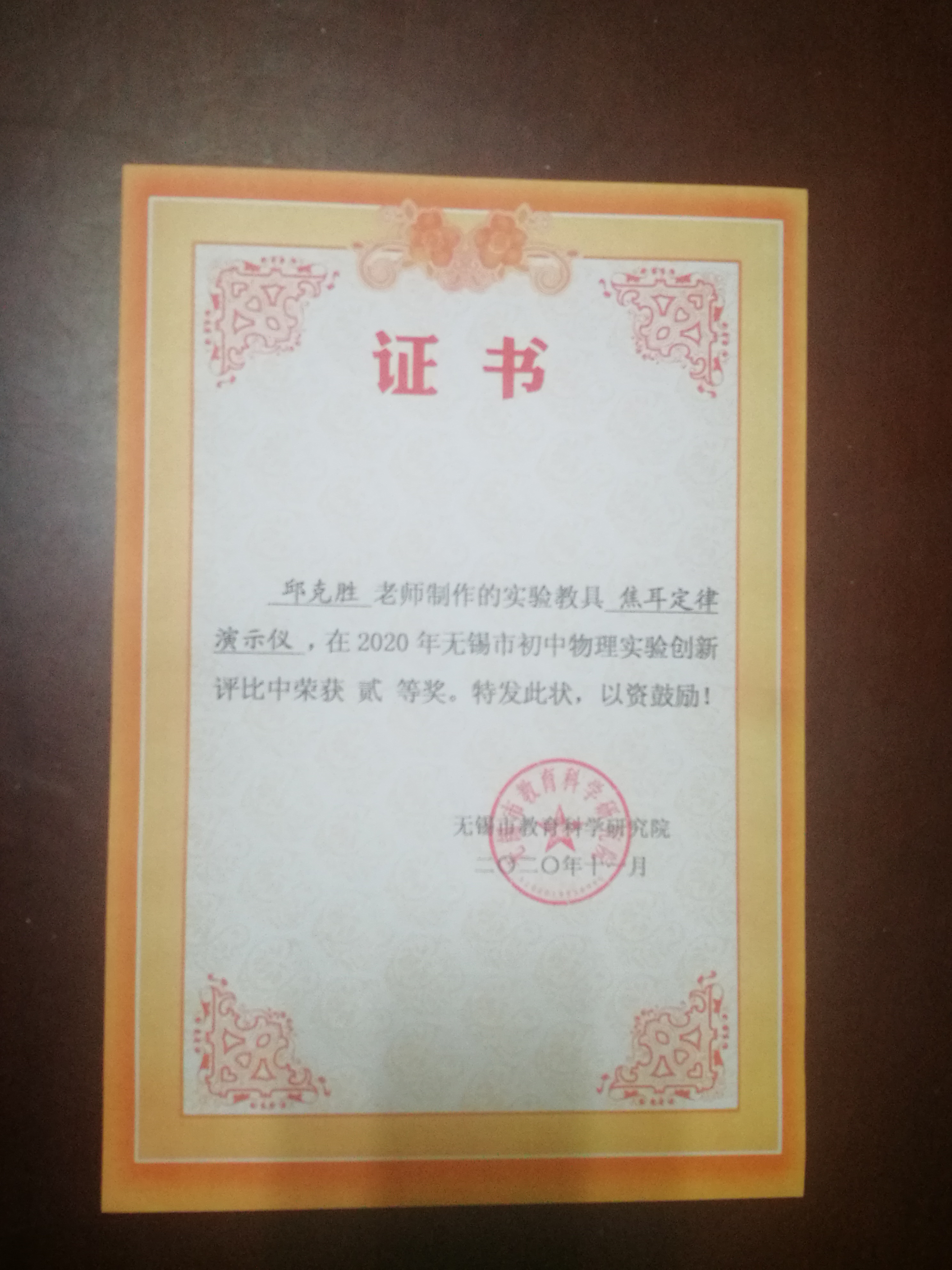 邱克胜老师在2020年无锡市初中物理实验创新评比中荣获二等奖