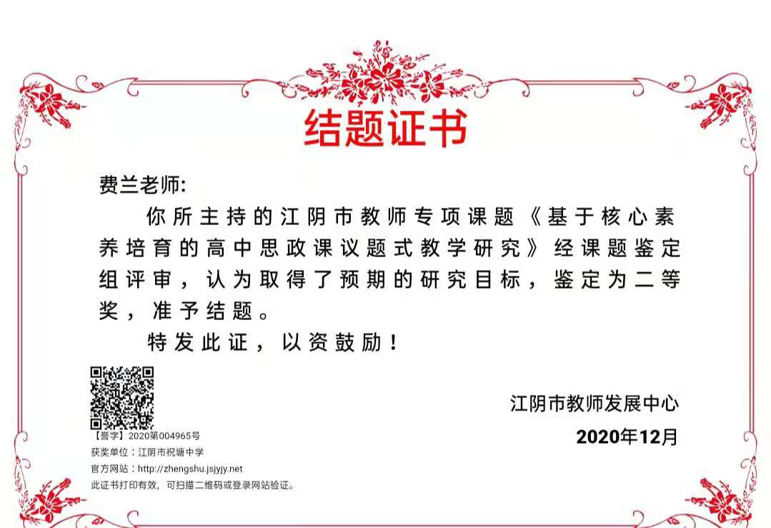 费兰江阴市课题《基于核心素养培育的高中思政课议题式教学研究》结题二等奖