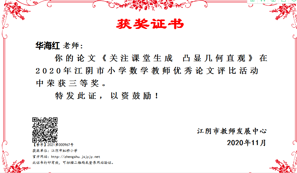 匡金龙名师工作室成员华海红老师的论文获江阴市三等奖