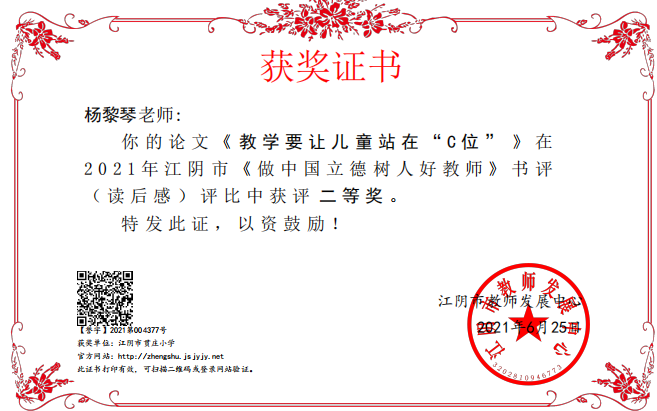 包静娟数学理解工作室成员杨黎琴老师在江阴市读书比赛中获二等奖