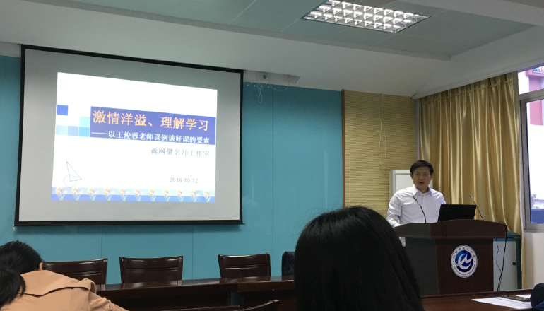 最后,名师工作室领衔人蒋网健校长对这两节课进行了精彩的点评,并作了“激情洋溢、理解学习——以王俊蓉老师课例谈好课的要素”的专题讲座。蒋校长从好课的定义、好课的标准、公开课的类型及研究好课的观察要点等几个方面将自己的认识和经验毫无保留地传递给了到场的每一位老师。