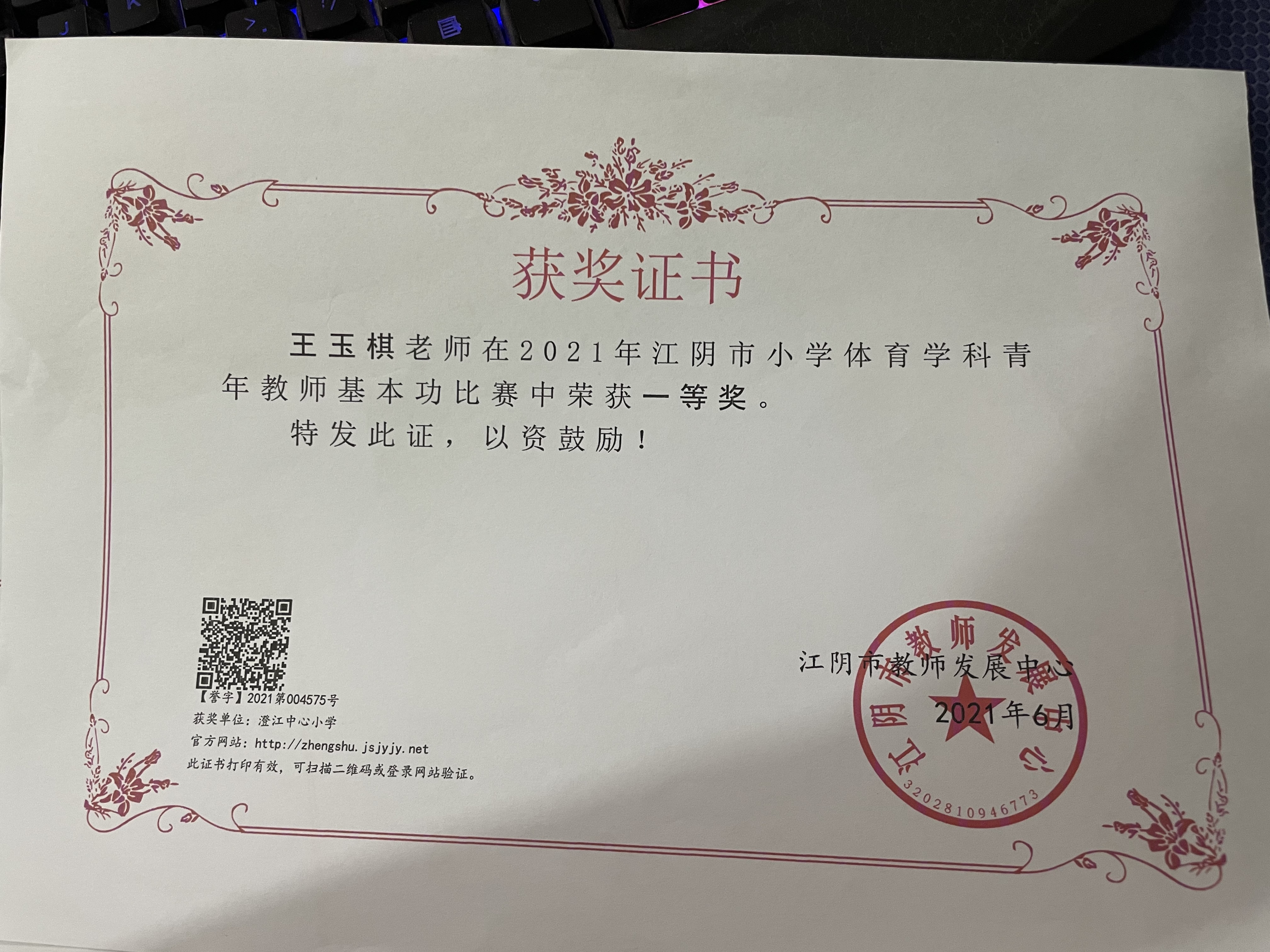 沈菁名师工作室成员 王玉棋 获江阴市小学体育学科教师基本功比赛一等奖