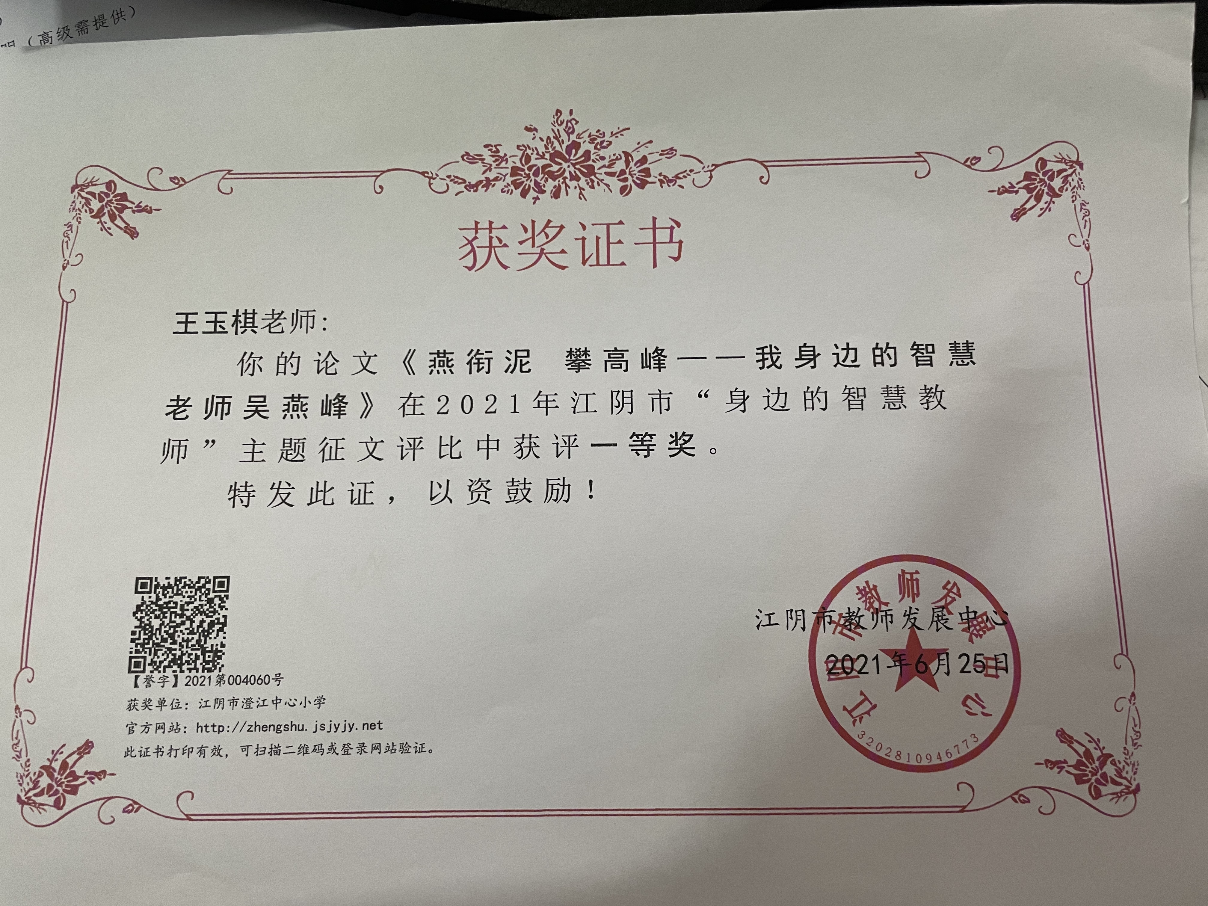 沈菁名师工作室成员 --王玉棋 获江阴市“身边智慧教师”主题征文评比 一等奖